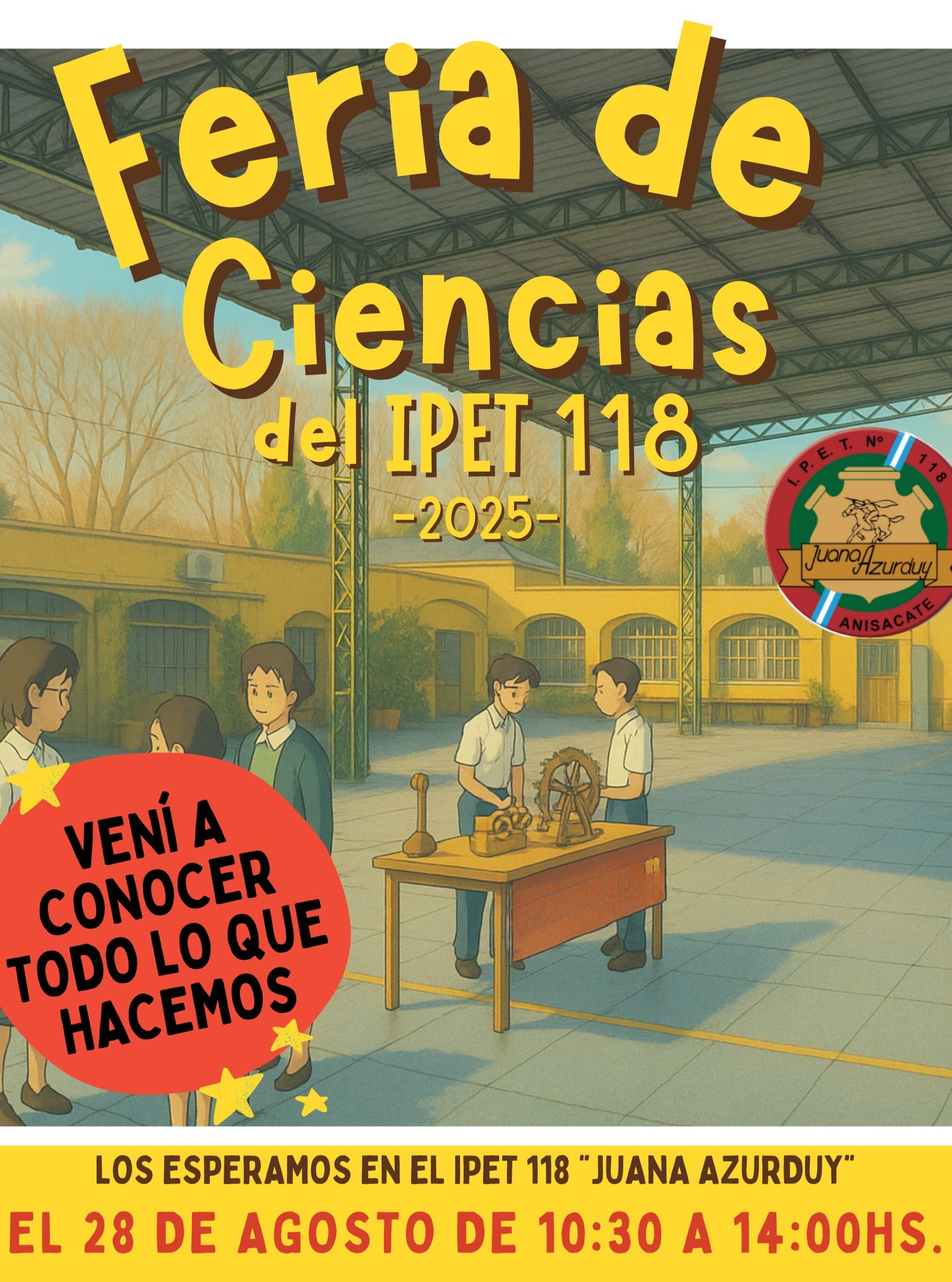 El próximo jueves 28 de agosto, el IPET 118 “Juana Azurduy” será escenario de una nueva edición de su Feria de Ciencias. Se trata de un espacio de exposición, pero también de creación, donde las y los estudiantes ponen en juego sus conocimientos para transformar realidades, desde la propia escuela hasta la vida cotidiana de la comunidad.